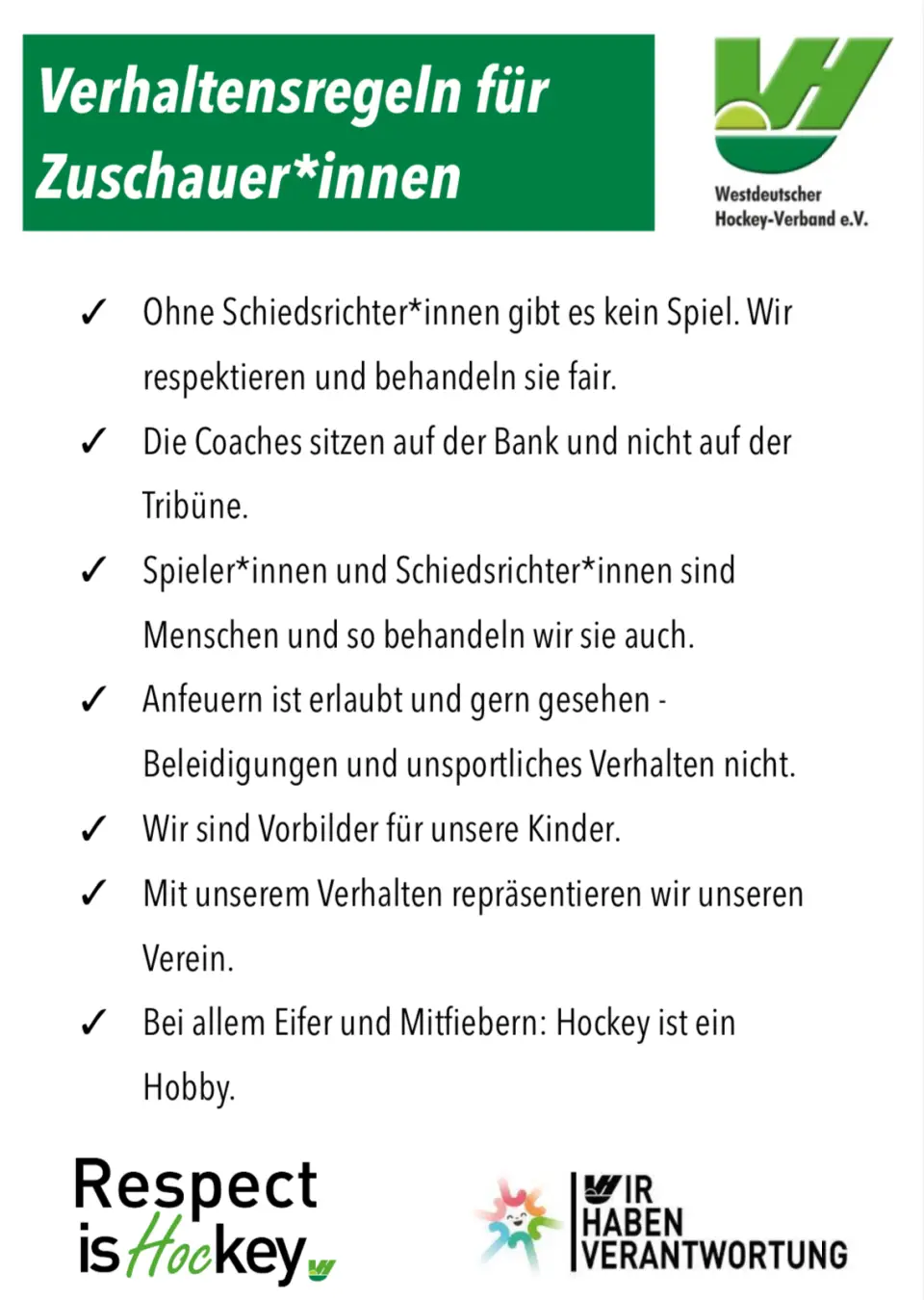 Der Westdeutsche Hockeyverband freut sich, ein neues Poster zu Verhaltensregeln für Zuschauer*innen vorzustellen, welches ab sofort für alle Vereine zum Download bereitsteht. Diese Richtlinien wurden vom Schiedsrichterausschuss (SRA) in enger Zusammenarbeit mit dem Jugendbereich sowie einigen Vereinen entwickelt, die die Idee in den Meetings zur Zukunft des Schiedsrichterwesens eingebracht haben.